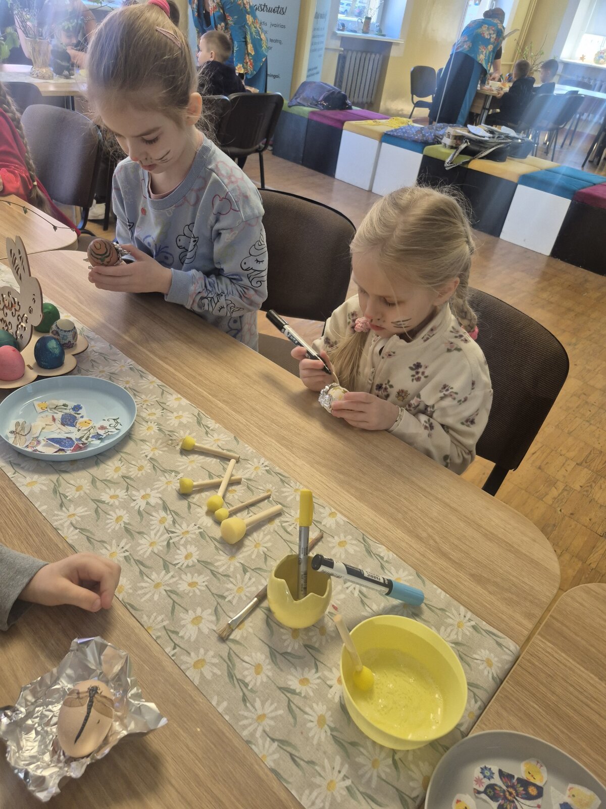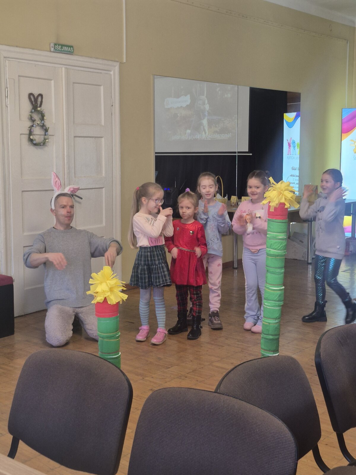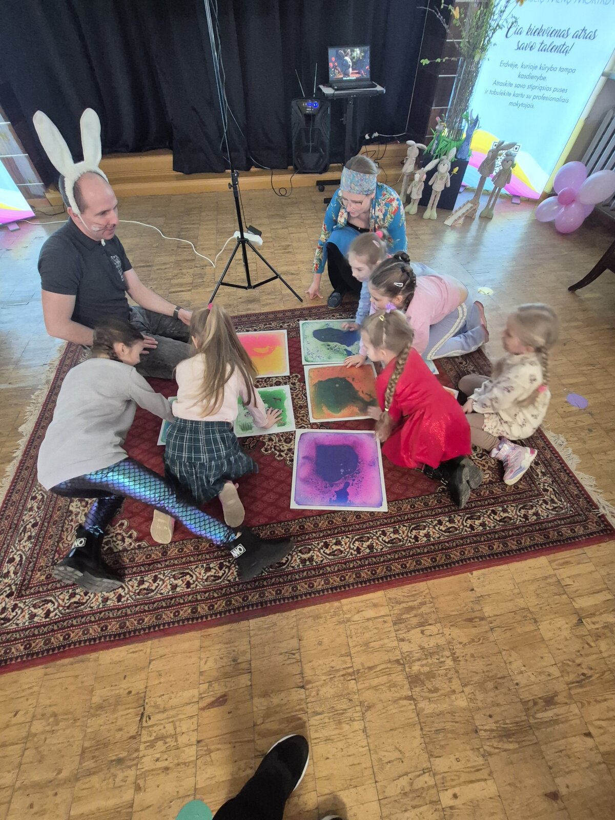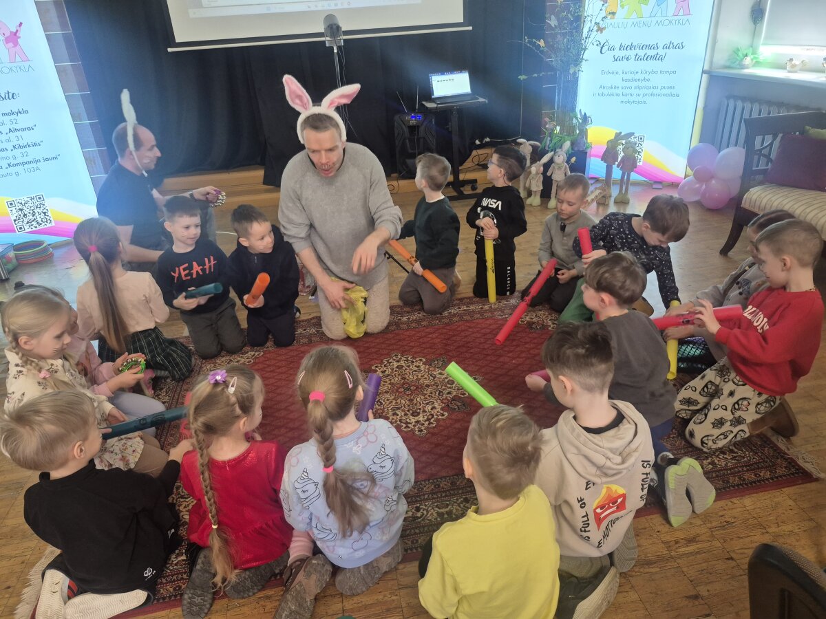 Balandžio 9 d. grupės „Gėlytės“ vaikai lankėsi Šiaulių menų mokykloje, kur jų laukė smagus ir turiningas susitikimas su Velykų bobute bei linksmais kiškučiais. Kiškučiai pakvietė vaikus pasimankštinti, pajudėti ir pažaisti nuotaikingus žaidimus, kurie suteikė daug juoko ir džiugių emocijų. Netrukus atvyko Velykų bobutė, kuri šiltai bendravo su vaikais, pasakojo apie gražią pavasario šventę – Velykėles, jų tradicijas ir papročius. Vėliau visi kartu mokėsi marginti kiaušinius – išbandė įvairius raštus, spalvas ir technikas, kūrybiškai puošė margučius. Edukacijos metu netrūko ir muzikos – vaikai turėjo galimybę išbandyti įvairius muzikos instrumentus, kartu grojo, klausėsi skirtingų garsų ir kūrė linksmą pavasarišką nuotaiką. Pabaigoje vaikus pradžiugino kiškučių staigmena – jie buvo apdovanoti skanėstais, kurie dar labiau sustiprino šventinę nuotaiką. Kupini įspūdžių, gerų emocijų ir gražių prisiminimų, vaikai grįžo į darželį, nešdamiesi savo pačių margintus margučius ir šypsenas veiduose.