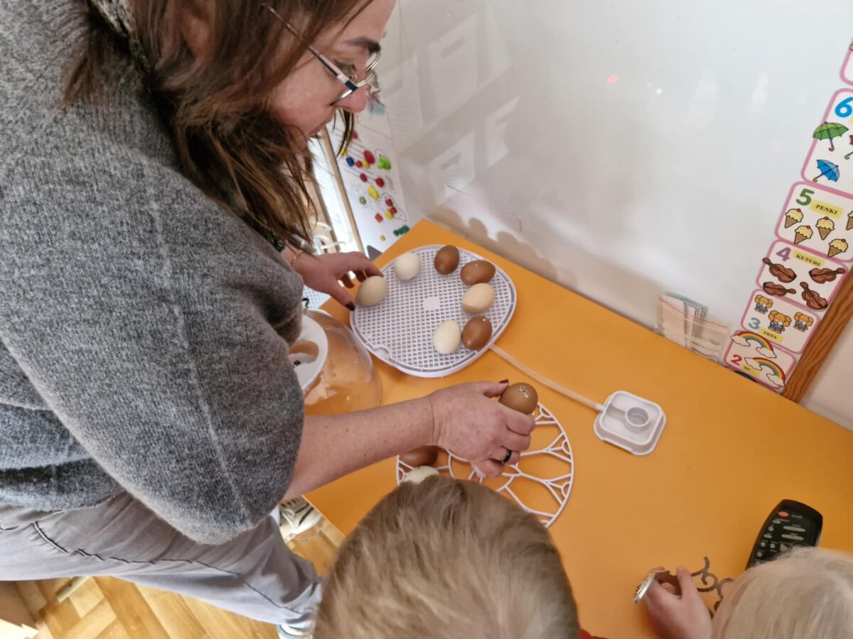 „Spindulio“ ugdymo centro mokytoja Lilijana Maslauskienė atnešė į „Nykštukų“ grupę inkubatorių su kiaušiniais. Vaikai turėjo galimybę stebėti visą procesą – nuo kiaušinio iki viščiuko išsiritimo. Iš kiaušinių išsirito trys viščiukai. Vaikai stebėjo pokyčius, skaičiavo kiek išsirito viščiukų, kiek dar liko kiaušinių, lygino skaičius. Ši veikla buvo naudinga vaikams keliais aspektais. Jie praktiškai susipažino su gyvybės atsiradimo procesu, lavino pastabumą ir gebėjimą laukti. Stebėdami procesą, vaikai mokėsi kantrybės, atidumo bei ugdė empatiją suprasdami, kad gyvybei reikia rūpesčio ir saugumo. Skaičiuodami viščiukus ir likusius kiaušinius, vaikai ugdė matematinius įgūdžius, gebėjimą lyginti skaičius bei daryti išvadas. Tai buvo integruota Steam patirtinė veikla, kuri apjungė pažintinę, emocinę ir praktinę vaikų raidą.