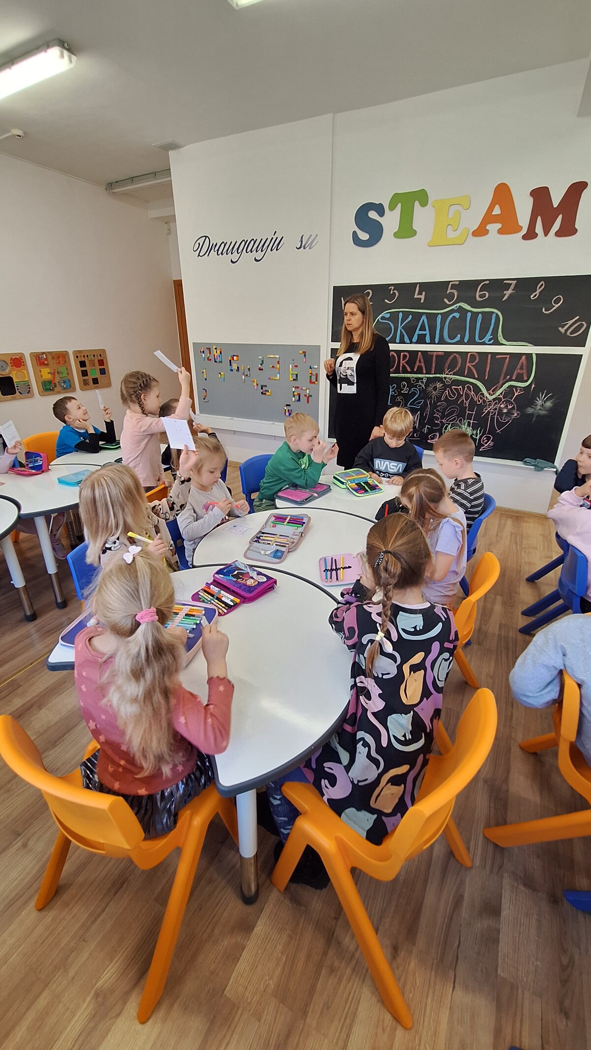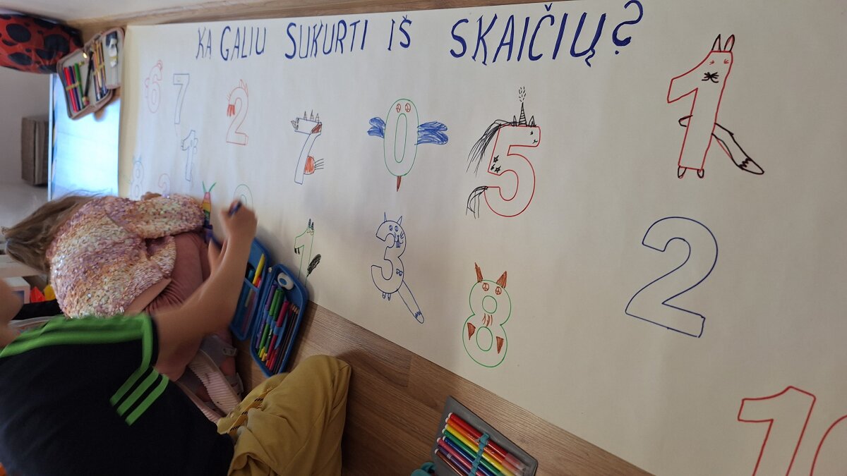 Spalio 22 dieną, STEAM centre vyko integruota STEAM veikla „Skaičių laboratorija“. Į veiklą „Meškučių“ grupės priešmokyklinukai pasikvietė Dainų progimnazijos priešmokyklinio ugdymo grupę ir jos mokytoją Justę. Veiklos metu ugdytiniai turėjo galimybę įtvirtinti matematinio suvokimo ir problemų sprendimo įgūdžius. Įtraukiančių veiklų metu ugdytiniai rinkosi jiems aktualias veiklas. Viena iš jų - panaudojant lego ir edukacinę sienelę sukonstruoti skaitmenis 10-ies ribose. Pasitelkiant traukos jėgą, ir panaudojant kokteilių šiaudelį, skaitmenis sudėlioti taip, kad jie sutaptų su lape pavaizduota skaičių seka. Iš popierinių puodelių statė bokštus pagal maketo pavyzdį taip lavindami inžinerinius gabumus. Panaudojant informacines technologijas – mokėsi naudotis išmanios „baltos lentos“ funkcijomis. O lavinant meninius, kūrybiškumo įgūdžius ant skaičiaus trafareto turėjo nupiešti gyvūną ar kitaip jį stilizuoti. Matematinius įgūdžius lavino skaičiuodami akmenėlius, sakičių sekai įtvirtinti dėliojo dėlionę su numeracija iki 10. Veiklos refleksijos metu, įsivertinę savo pastangas ir rezultatus, akcentavo, kad veikla labai įdomi ir jiems labai patiko. Gavę apdovanojimus ir diplomus pratęsėme veiklą grupėje.
