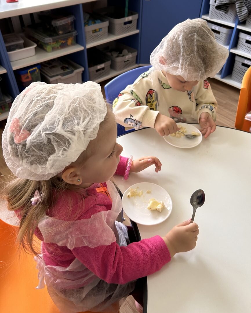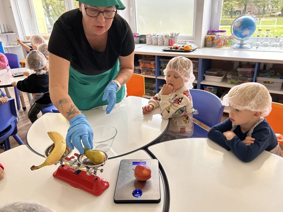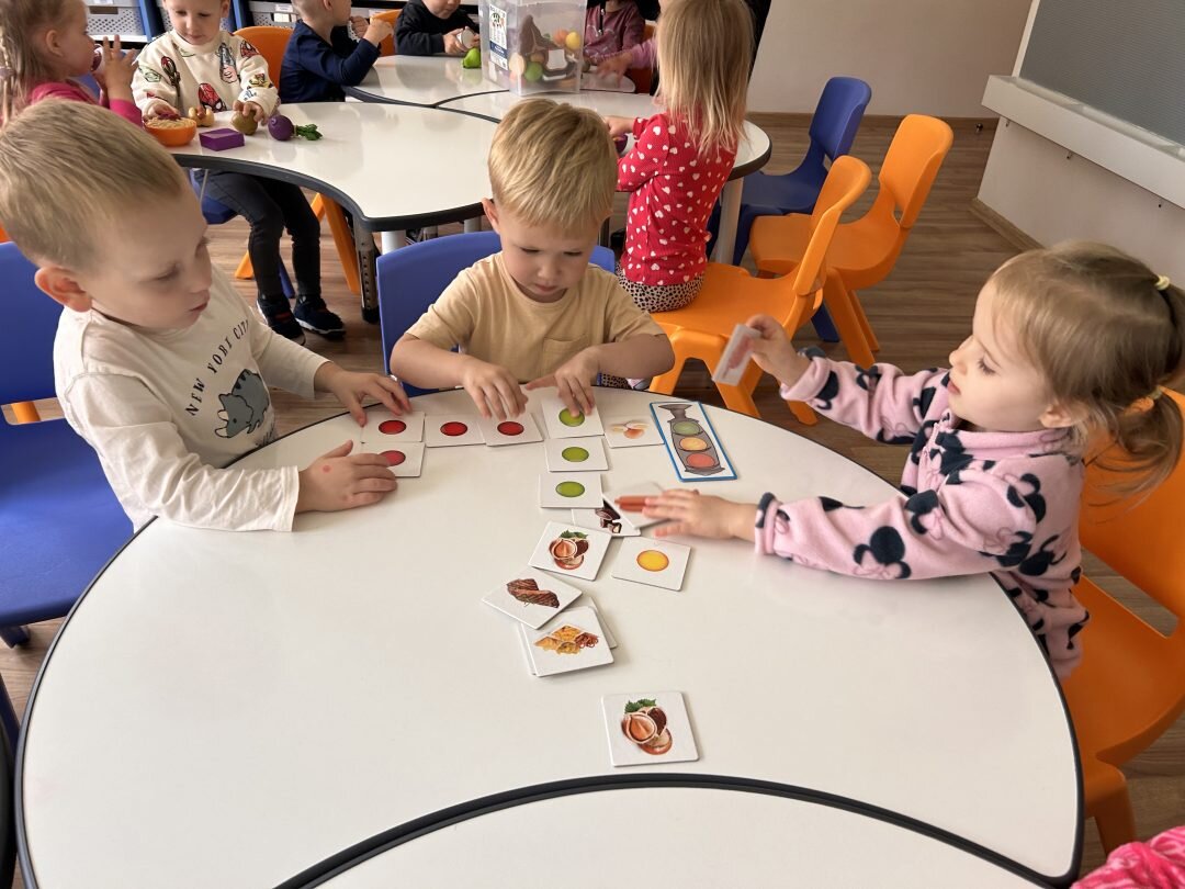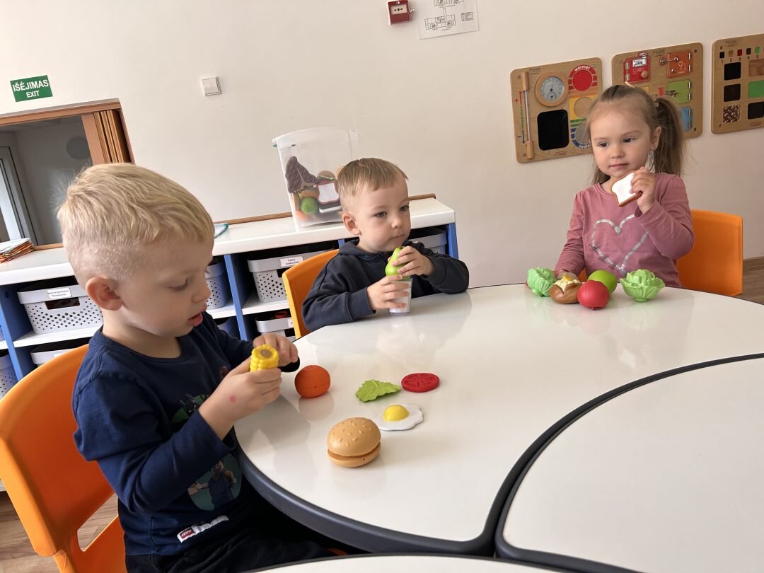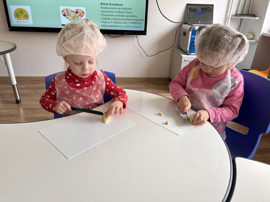 „Kiškučių" gr. ugdytiniai dalyvavo integruotoje STEAM veikloje „Daržovės ir vaisiai - sveikatos šaltiniai". Visuomenės sveikatos specialistė vaikams priminė kokios daržovės ir kokie vaisiai turi vitaminų. Vaikai pasikartojo pavadinimus, įsidėmėjo spalvas. Dėliojo dėlionę ką sveika valgyti, o ką nelabai sveika. Mokytoja Erika pakvietė vaikus pasverti vaisiu: bananą, obuolį, apelsiną. Nusiplovę rankas, vaikai draugiškai pjaustė vaisius ir iš jų pasigamino skanias ir sveikas vaisių salotas.