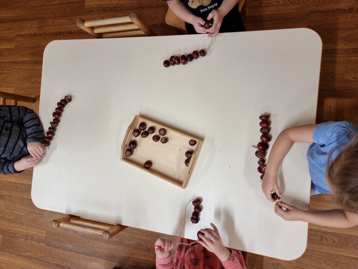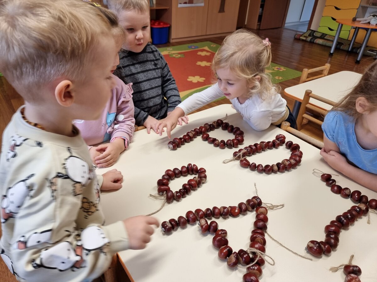 Spalvingą ir lietingą rudens dieną ,,Ančiukų" grupės vaikai leidosi į smagią pažinimo kelionę - STEAM veiklą ,,Rudenėlio paslaptys". Mažieji tyrinėtojai ėjo lapų takeliu, stebėjo jų spalvas, formas, klausėsi šnarėjimo, o paskui linksmai keldami rankas į viršų ir darė lapų lietų. Vėliau vaikai skaičiavo kaštonus, juos rūšiavo ir vėrė iš jų linksmas kirmėlaites. Kiekviena kirmėlaitė tapo ne tik smagiu žaisliuku, bet ir pagalbininke susipažįstant su raidelėmis. Iš suvertų kirmėlaičių dėliojo raideles, ieškojo savo vardo pirmosios raidelės. Veiklos pabaigoje mažieji tyrinėtojai atliko įdomų eksperimentą ,,Lietus stiklainyje". Stebėdami, kaip lašeliai, lyg iš dangaus nusileidžia į stiklainį, vaikai sužinojo, kaip gamtoje susidaro lietus. Ši veikla leido vaikams ne tik pažinti rudens grožį, bet ir lavinti smalsumą, kūrybiškumą bei tyrinėjimo gebėjimus.