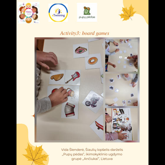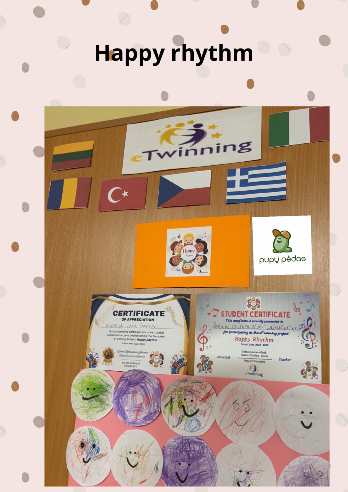 Šių metų rugsėjo-lapkričio mėnesiais darželio grupių „Kiškučiai", „Ančiukai" ir „Ežiukai" ugdytiniai kartu su mokytojomis Erika, Vida ir Loreta dalyvavo eTwinning projekte „Linksmasis ritmas". Projektas suvienijo net šešias šalis - Lietuvą , Rumuniją , Turkiją , Italiją , Graikiją , Čekijos Respubliką. Projekto tikslas buvo ugdyti vaikų gebėjimą klausytis, atpažinti, įvardyti aplinkos garsus; skatinti vaikų saviraišką per kūrybinę ir meninę veiklą, įtraukti vaikus į tyrinėjimus ir atradimus per garso atpažinimą ir paprastus eksperimentus, skatinti bendraamžių bendradarbiavimą ir emocinę raišką per bendrą veiklą, naudoti įvairias skaitmenines ir kūrybines priemones garsams įrašyti ir pateikti. Vaikai patyrė džiaugsmą kurdami garsus ir ritmus, išmoko atpažinti aplinkos garsus, sustiprėjo jų gebėjimas reikšti mintis, emocijas, kurti ritmo žaidimus. Tai buvo šaunus bendradarbiavimas tarp įvairių kultūrų .