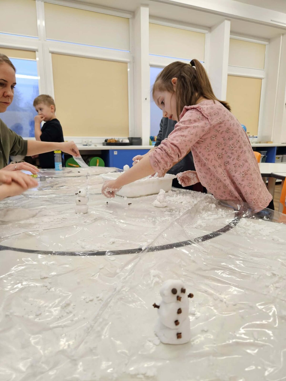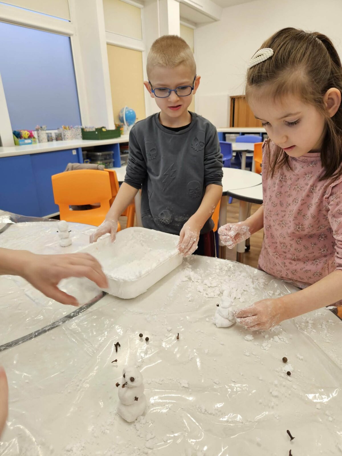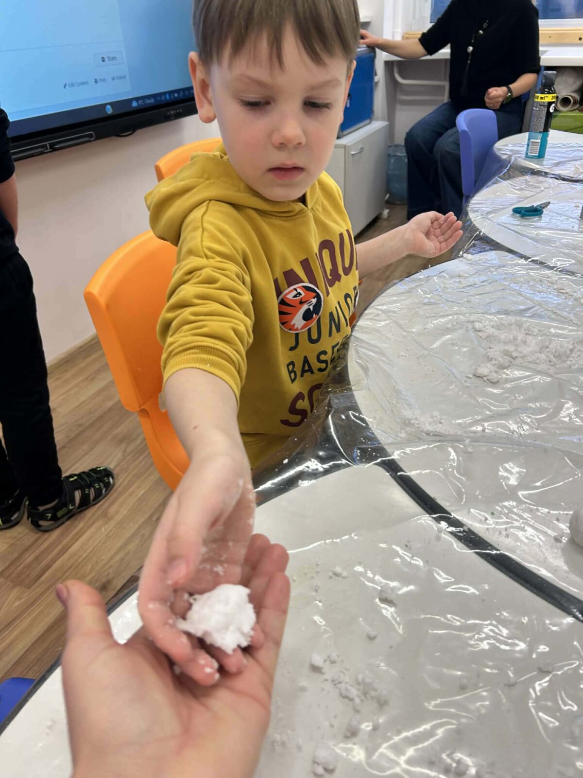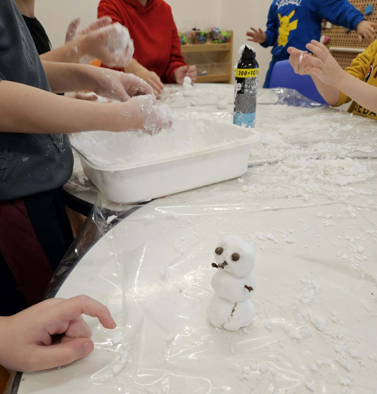 Grupės „Boružėlės“ vaikai, negalėdami pasidžiaugti sniegu lauke, nusprendė jį pasigaminti patys. Dirbtiniam sniegui gaminti jie naudojo du komponentus: valgomąją sodą ir skutimosi putas. Vaikai aktyviai įsitraukė į eksperimentavimo ir stebėjimo procesą. Pirmiausia ugdytiniai išsiaiškino, kokiomis savybėmis pasižymi valgomoji soda ir skutimosi putos. Sumaišius šias dvi medžiagas, įvyko tikras stebuklas – jos virto „sniegu“. Iš pagaminto „sniego“ vaikai kūrė nuotaikingus senius besmegenius. Veiklos metu vaikai patyrė pažinimo džiaugsmą, lavino smalsumą ir plėtojo kūrybinius gebėjimus.