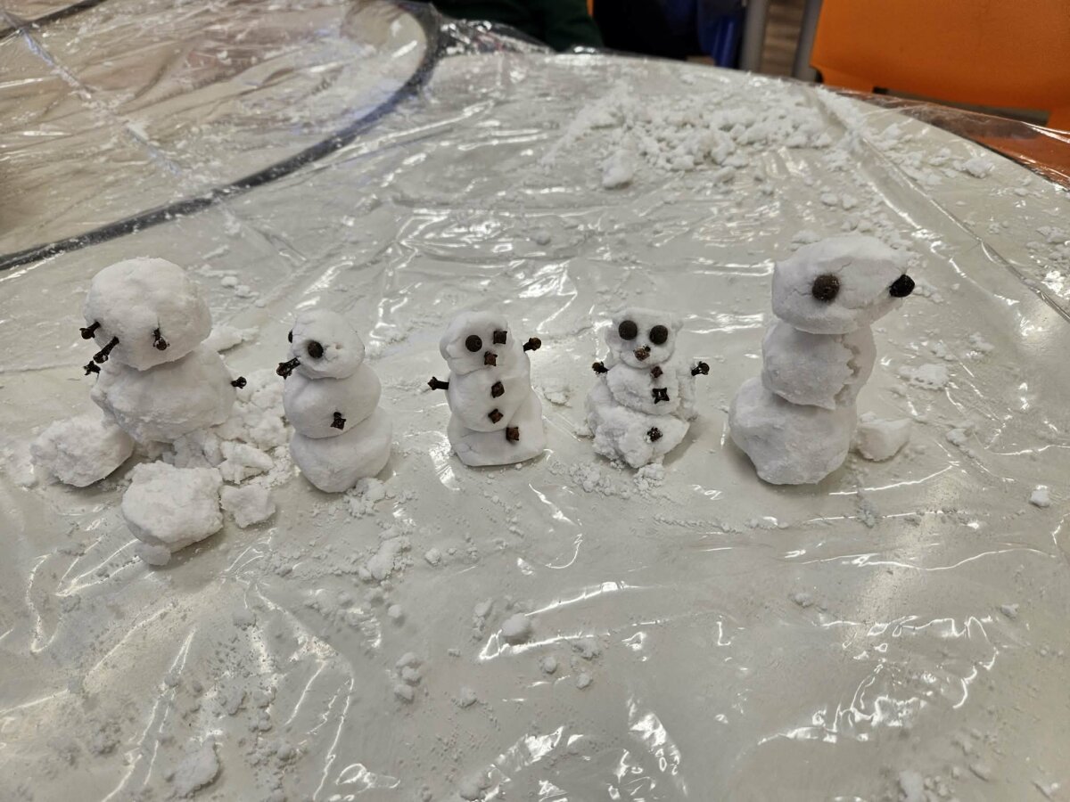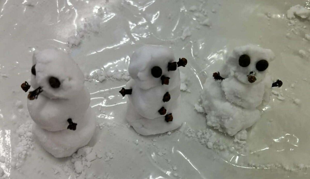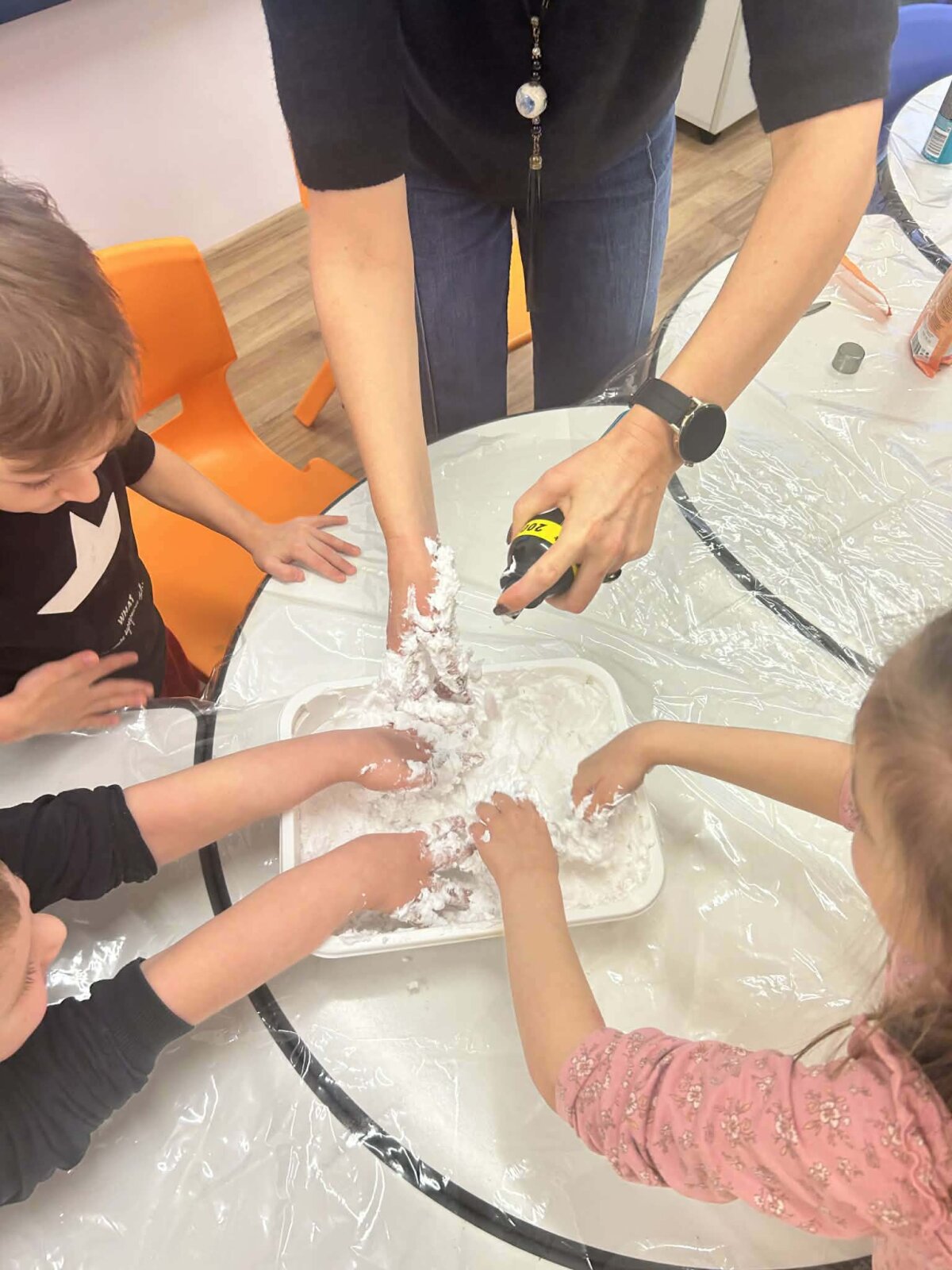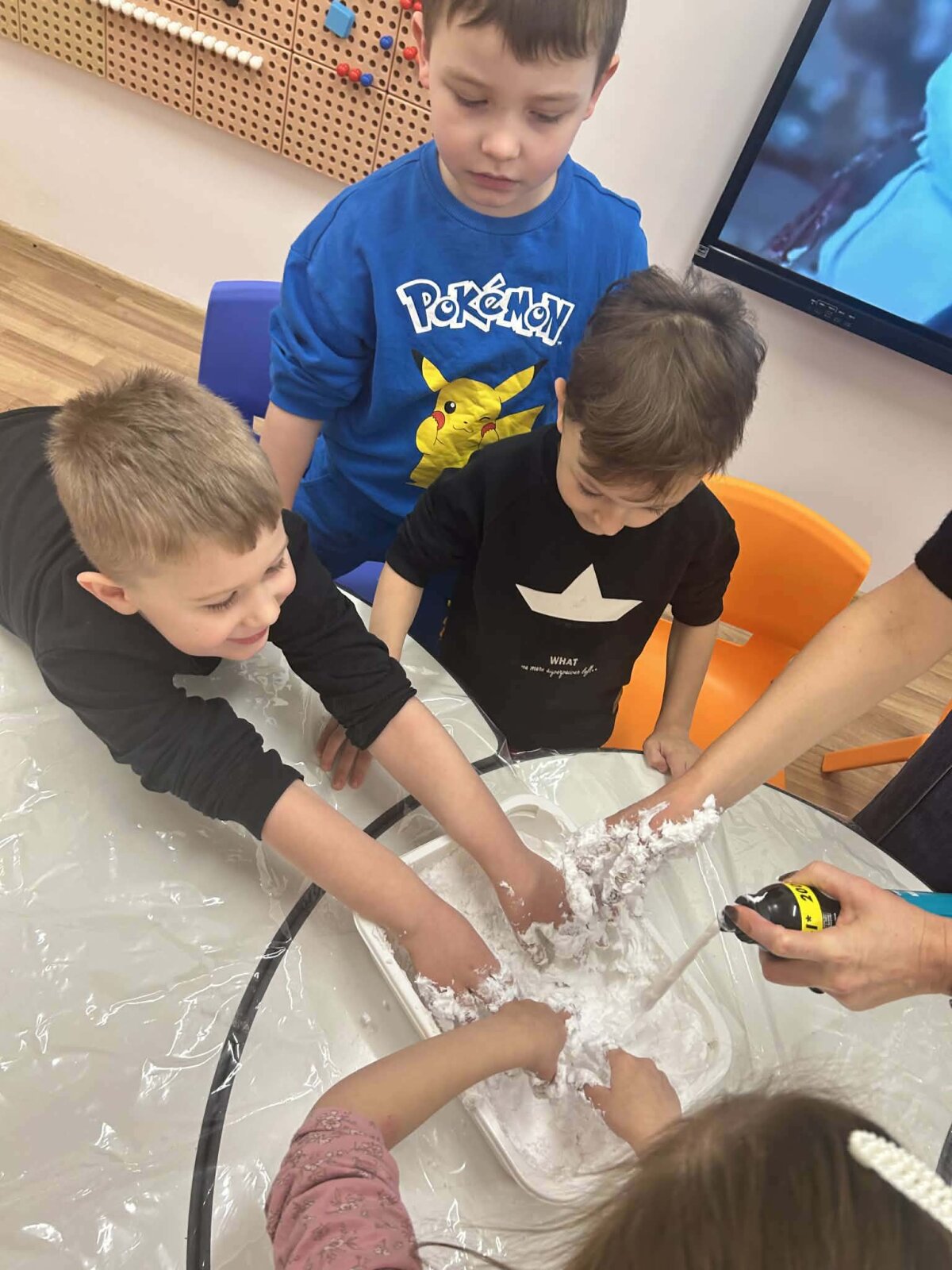 Grupės „Boružėlės“ vaikai, negalėdami pasidžiaugti sniegu lauke, nusprendė jį pasigaminti patys. Dirbtiniam sniegui gaminti jie naudojo du komponentus: valgomąją sodą ir skutimosi putas. Vaikai aktyviai įsitraukė į eksperimentavimo ir stebėjimo procesą. Pirmiausia ugdytiniai išsiaiškino, kokiomis savybėmis pasižymi valgomoji soda ir skutimosi putos. Sumaišius šias dvi medžiagas, įvyko tikras stebuklas – jos virto „sniegu“. Iš pagaminto „sniego“ vaikai kūrė nuotaikingus senius besmegenius. Veiklos metu vaikai patyrė pažinimo džiaugsmą, lavino smalsumą ir plėtojo kūrybinius gebėjimus.