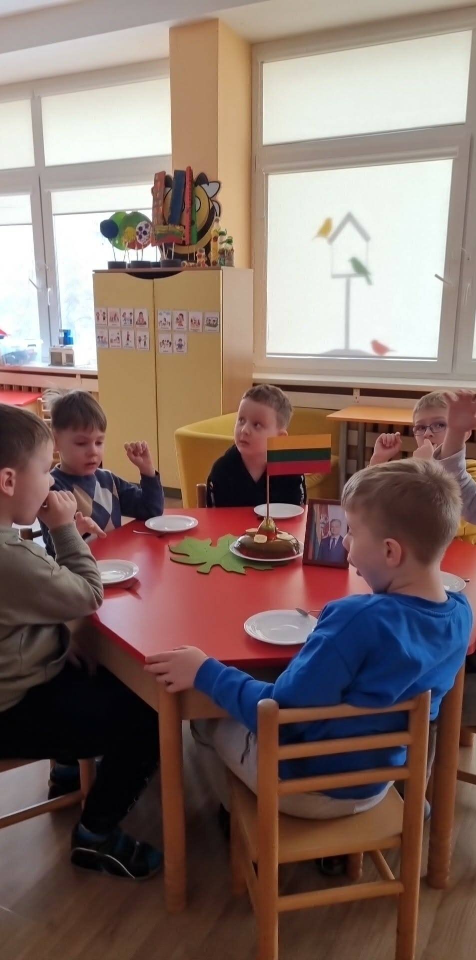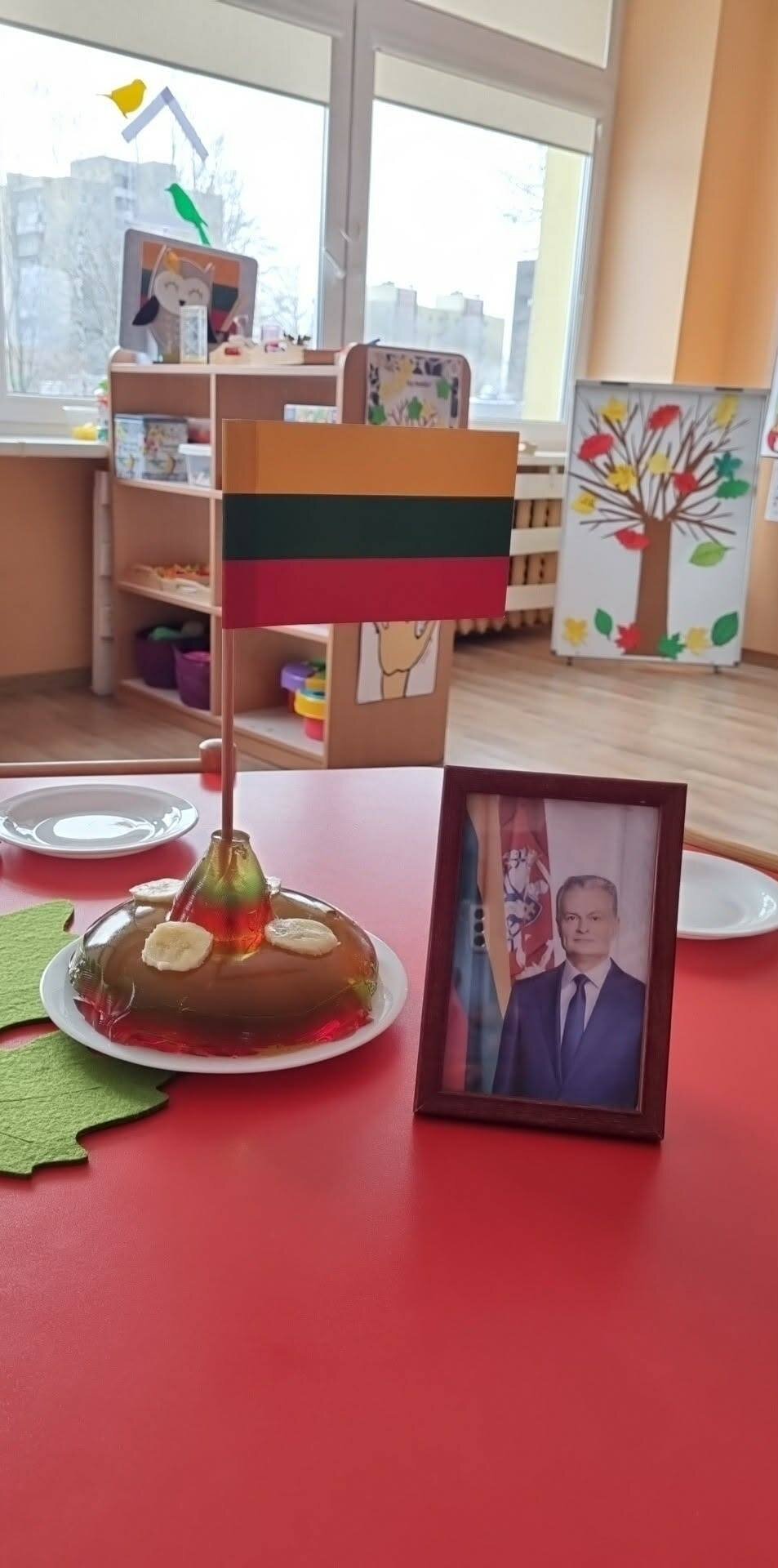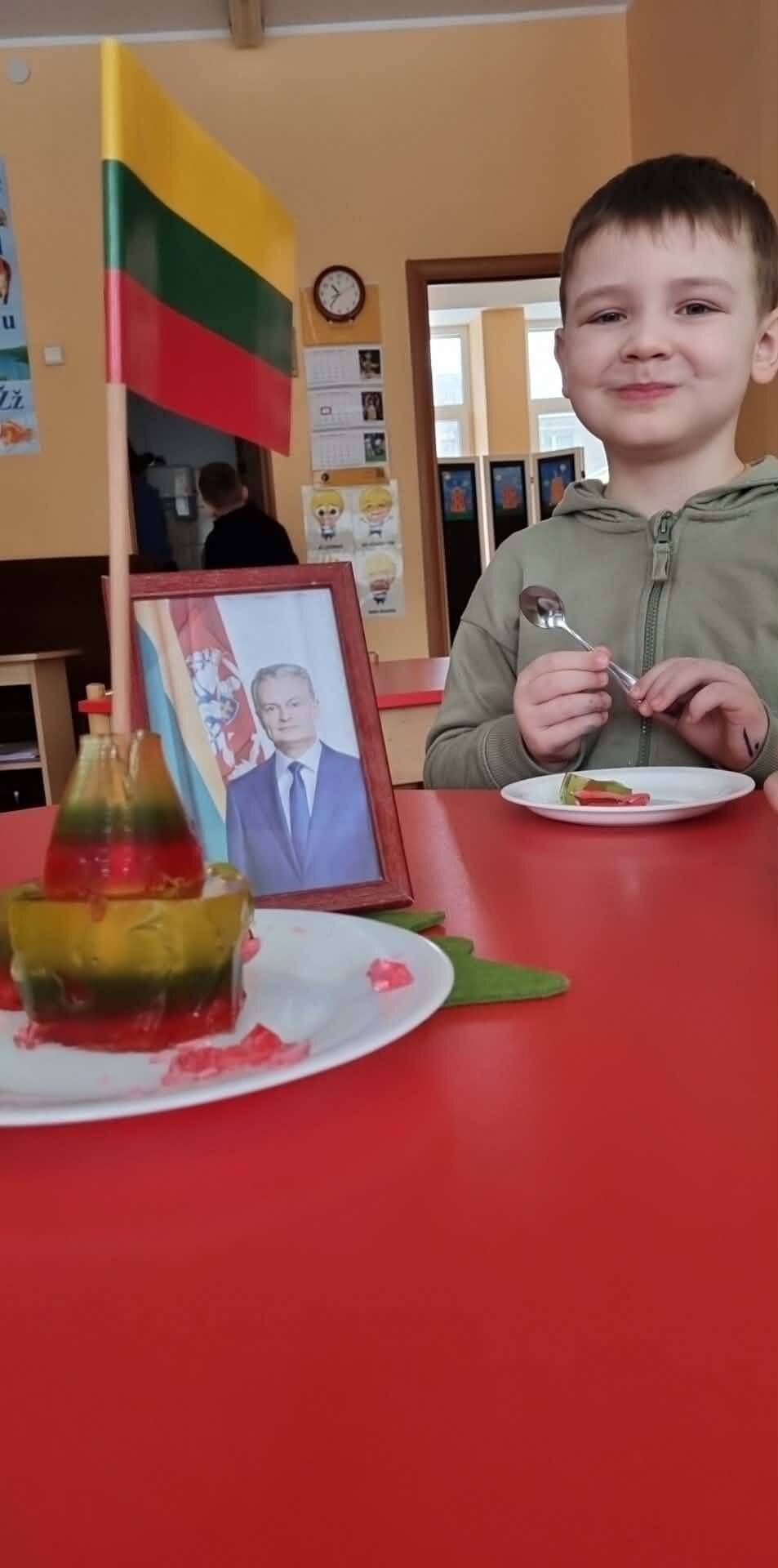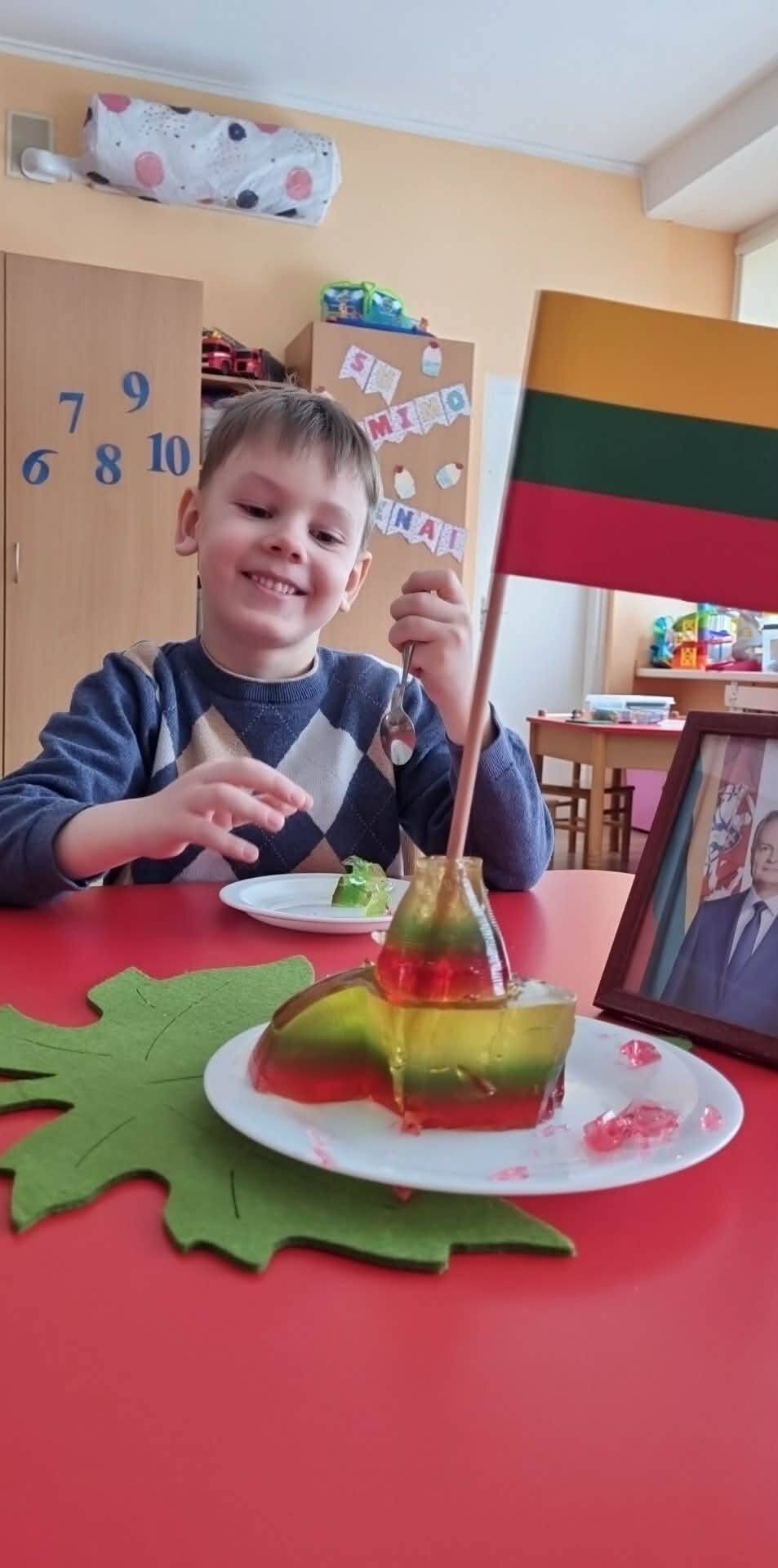 Vasario 9, 10 dienomis „Boružėlės“ grupės ugdytiniai paminėjo artėjančią Lietuvos valstybės atkūrimo dieną - Vasario 16-ąją. Šią ypatingą progą vaikai pažymėjo kūrybiškai ir prasmingai - pasigamino trispalvį tortą. Veiklos metu vaikai įvardijo Lietuvos vėliavos spalvas - geltoną, žalią ir raudoną. Išsiaiškinome, kad Lietuvos vėliavą sudaro trys spalvos, aptarėme jų reikšmes. Taip pat prisiminėme, kas yra Lietuvos prezidentas, Lietuvos sostinė. Kalbėjome apie Vilniuje stovinčią Gedimino pilį, kuri yra viena svarbiausių mūsų šalies simbolių. Taip pat prisiminėme kokia Lietuvos valstybės valiuta. Atėjo pati laukiamiausia akimirka. Vaikai nekantriai susibūrė aplink stalą ir grožėjosi trispalviu žele tortu. Atsargiai pjaustėme tortą, viduje aiškiai matėsi geltonas, žalias ir raudonas sluoksniai. Mažos rankytės paėmė gabalėlius, o akys suspindo džiaugsmu. Vaikai ragavo, šypsojosi, ir džiaugėsi savo bendru darbu. Ši veikla suteikė daug teigiamų emocijų, padėjo geriau pažinti Lietuvą, jos simbolius bei stiprinti meilę Tėvynei.