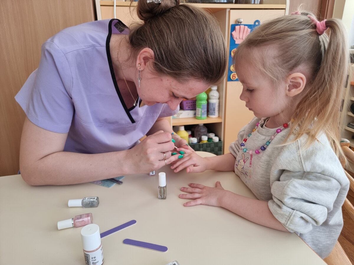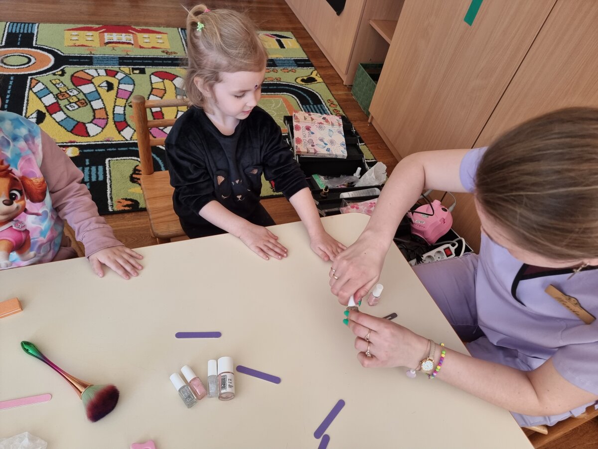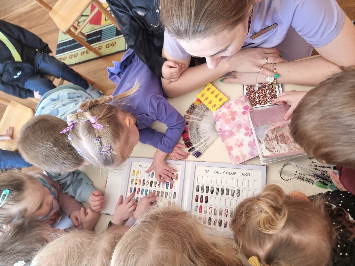 Balandžii 9-oji buvo ypatinga ir džiugi diena ,,Ančiukų" grupėje, kupina naujų patirčių ir įspūdžių. Tądien grupėje veikė tikras grožio salonas – vyko profesinio veiklinimo projektas „Tėvelių pėdomis“. Į svečius atvykusi Patricijos mamytė atsinešė manikiūro priemones, jas pristatė vaikams ir papasakojo, kaip tinkamai prižiūrimi nagučiai. Vaikai su dideliu susidomėjimu įsitraukė į veiklą – geliniu laku lakavo rankyčių trafaretų nagus ir stebėjo, kaip jie džiovinami ultravioletinių spindulių lempoje. Vėliau mamytė mergaitėms nulakavo tikrus nagučius ir papuošė juos spalvingais lipdukais. Berniukai taip pat neliko nuošalyje – jie savo nagučius dekoravo lipdukais ir džiaugėsi rezultatu. Procedūros pabaigoje visi nagučiai buvo patepti aliejuku, o rankytės palepintos švelniu kremu. Ši veikla vaikams suteikė daug džiaugsmo, naujų žinių ir galimybę iš arčiau susipažinti su grožio specialisto profesija. Tai buvo ne tik smagi, bet ir prasminga patirtis, kuri dar ilgai išliks vaikų atmintyje.