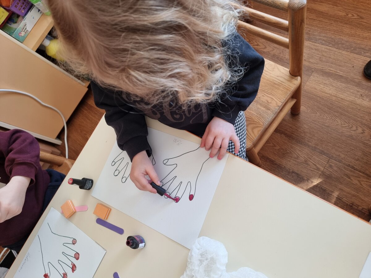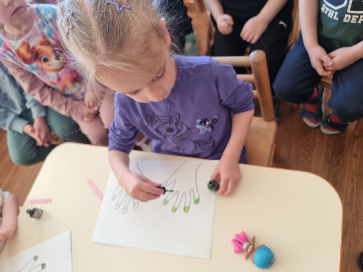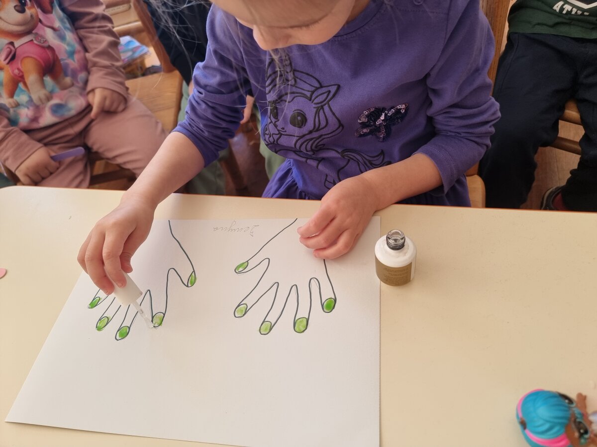 Balandžii 9-oji buvo ypatinga ir džiugi diena ,,Ančiukų" grupėje, kupina naujų patirčių ir įspūdžių. Tądien grupėje veikė tikras grožio salonas – vyko profesinio veiklinimo projektas „Tėvelių pėdomis“. Į svečius atvykusi Patricijos mamytė atsinešė manikiūro priemones, jas pristatė vaikams ir papasakojo, kaip tinkamai prižiūrimi nagučiai. Vaikai su dideliu susidomėjimu įsitraukė į veiklą – geliniu laku lakavo rankyčių trafaretų nagus ir stebėjo, kaip jie džiovinami ultravioletinių spindulių lempoje. Vėliau mamytė mergaitėms nulakavo tikrus nagučius ir papuošė juos spalvingais lipdukais. Berniukai taip pat neliko nuošalyje – jie savo nagučius dekoravo lipdukais ir džiaugėsi rezultatu. Procedūros pabaigoje visi nagučiai buvo patepti aliejuku, o rankytės palepintos švelniu kremu. Ši veikla vaikams suteikė daug džiaugsmo, naujų žinių ir galimybę iš arčiau susipažinti su grožio specialisto profesija. Tai buvo ne tik smagi, bet ir prasminga patirtis, kuri dar ilgai išliks vaikų atmintyje.