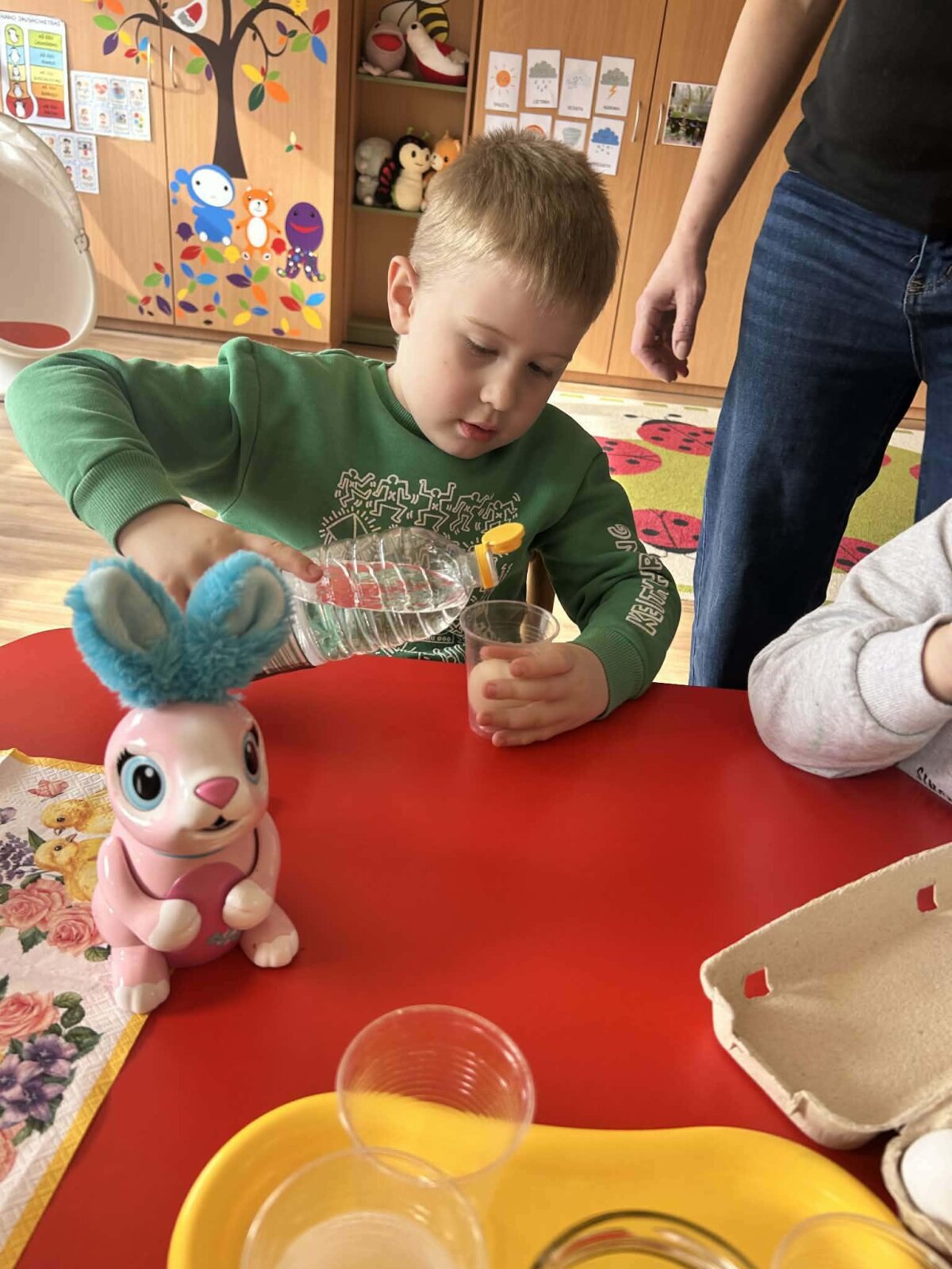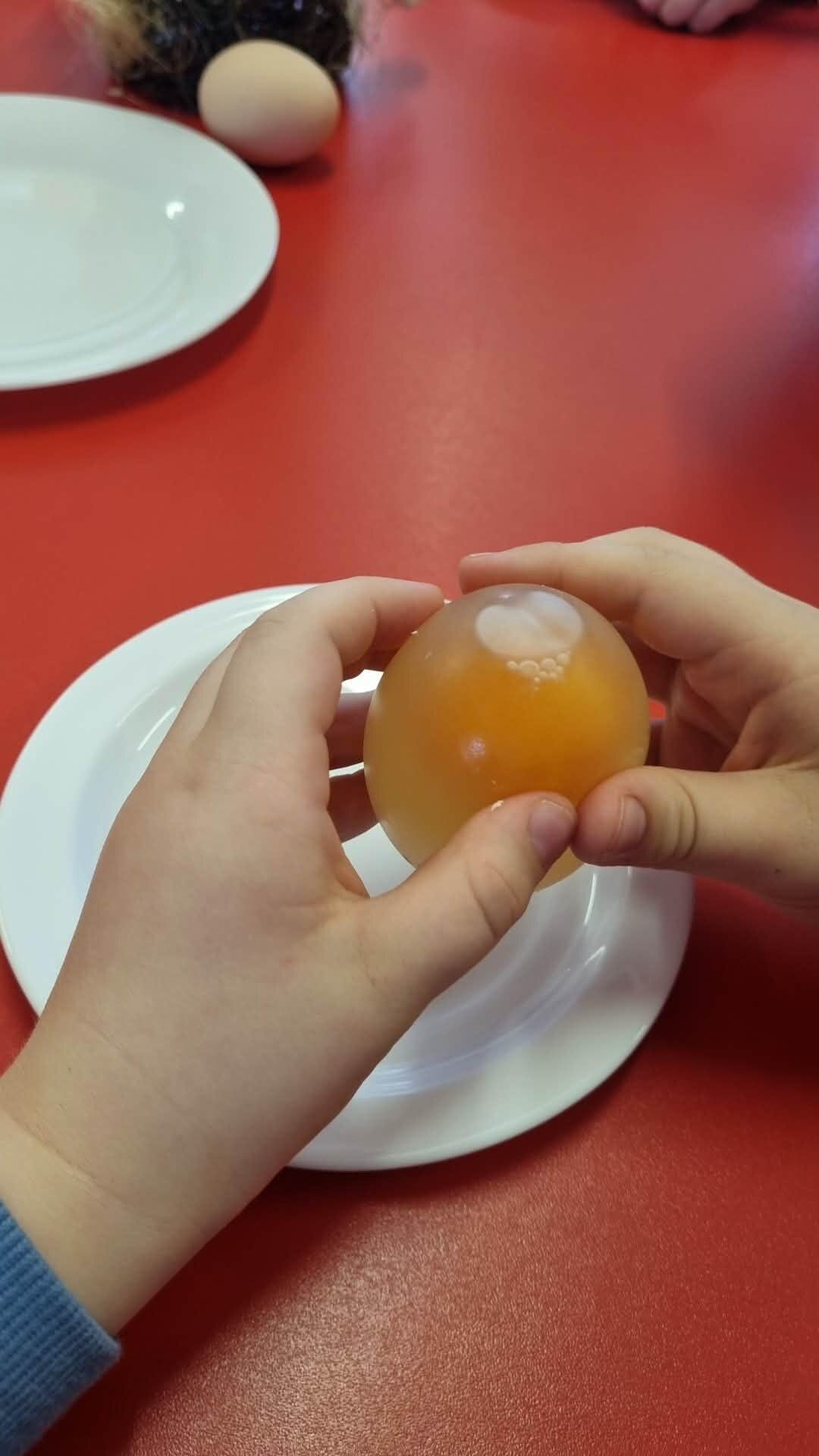 ,,Boružėlės" grupėje STEAM veiklos metu vaikai tyrinėjo paprastą cheminį procesą – panardino kiaušinį į actą ir stebėjo vykstančius pokyčius. Tokia veikla ugdo smalsumą, skatina kelti klausimus, spėlioti bei nuosekliai stebėti eksperimento eigą ir rezultatus. Vaikai mokosi apibūdinti pastebėtus pokyčius, lavina kalbinę raišką ir kritinį mąstymą. Ši veikla integruoja gamtamokslinį pažinimą, skaičiavimo įgūdžius (laiko sekimą) bei socialinius gebėjimus dirbant grupėje. Taip pat stiprinamos tyrinėjimo, problemų sprendimo ir patirtinio mokymosi kompetencijos. Po 24–48 valandų kiaušinio lukštas ištirpsta dėl acto rūgšties poveikio. Kiaušinis tampa minkštas, elastingas, primena „guminį“ kamuoliuką – jis gali lengvai šokinėti ir net šiek tiek padidėja, nes per pusiau laidžią plėvelę į jo vidų patenka skystis.