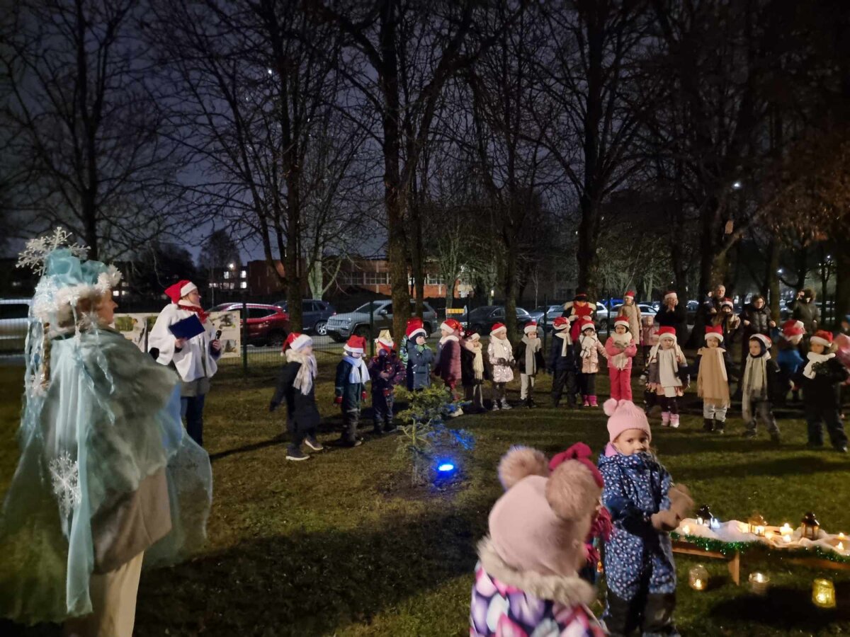 Gruodžio 10 d. mūsų darželio kiemą užliejo ypatinga nuotaika – čia vyko eglutės įžiebimo šventė. Mažieji darželinukai, lydimi mokytojų ir tėvelių, susirinko pasitikti artėjančių Kalėdų bei kartu sukurti šventinę stebuklo akimirką. Šventėje skambėjo dainelės, patys drąsiausi „Gėlyčių“ grupės vaikai šoko, vilkėjo nykštukų kepuraites, kiti puošėsi žibančiomis snaigutėmis. Į šventę atvykę: Nykštukas, Senis besmegenis bei Šalna pakvietė vaikus suskaičiuoti iki trijų bei pasakyti burtažodį. Kai nuskambėjo paskutinis skaičius, eglutė sužibo ryškiomis lemputėmis, sukeldama mažiesiems tikrą džiaugsmo šūksnį. Vaikų akys suspindo ne mažiau nei pati eglė. Tikimės, kad eglutės įžiebimas darželyje taps ne tik gražia tradicija, bet ir širdį šildančia akimirka, kurią vaikai ir tėveliai dar ilgai prisimins.