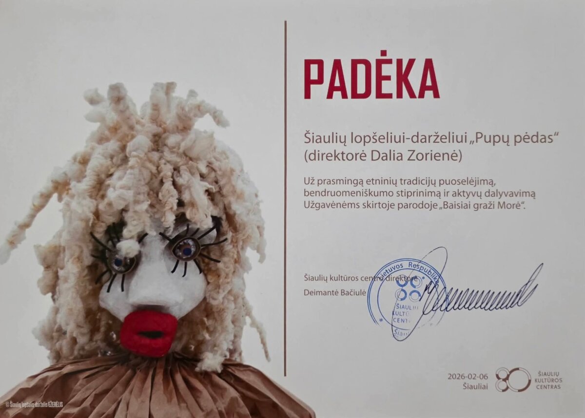 2026 m. vasario 17 d. Kaštonų alėjoje vyko „Baisiai gražių Morių“ paroda - konkursas. Renginyje aktyviai dalyvavo ne tik mokyklos, darželiai ir bibliotekos, bet ir kitos miesto įstaigos, puoselėjančios šią gražią tradiciją. Iš viso buvo pristatytos net 36 Morės, tarp jų - ir mūsų Šiaulių lopšelio-darželio „Pupų pėdas“ sukurta Morė. „Baisiai“ gražiai pasipuošusi darželio komanda iškilmingai palydėjo savo Morę nuo Kaštonų alėjos iki Geležinės lapės. Šventinė eisena, lydima geros nuotaikos pasiekė Talkšos ežeras pakrantę, kur prie „Geležinės lapės“ tęsėsi linksmybės. Renginio metu vyko tradicinė Lašininio ir Kanapinio dvikova, buvo paskelbti parodos-konkurso „Baisiai graži Morė“ rezultatai bei įteikti apdovanojimai. Šventę vainikavo Morės deginimo ceremonija, šokiai, dainos ir smagūs žaidimai. Dėkojame organizatoriams už šventę, tariame ačiū visiems, balsavusiems už lopšelio-darželio „Pupų pėdas“ Morę. Tikime, kad po tokios smagios šventės žiema pasitrauks, o netrukus sulauksime šilto ir saulėto pavasario.