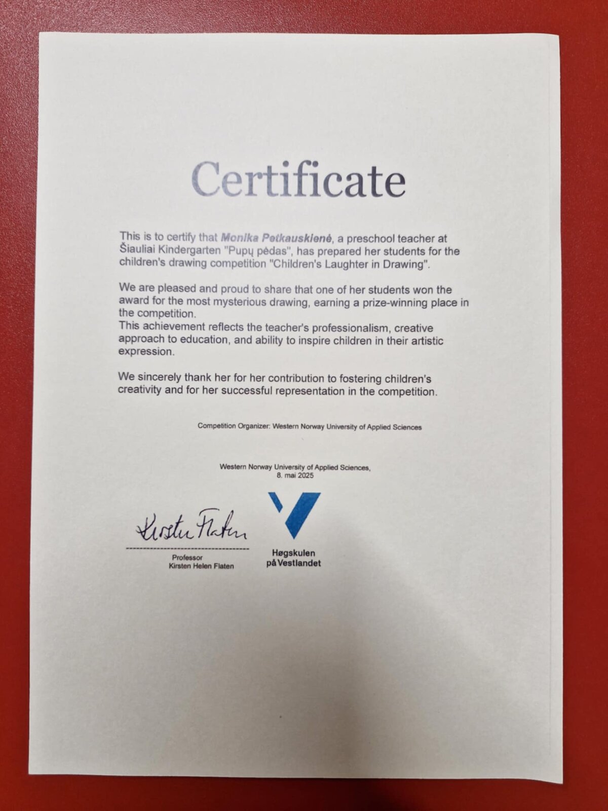 Mūsų įstaigos ugdytinė dalyvavo Vilniaus universiteto Šiaulių akademijos Edukologijos instituto organizuotame vaikų piešinių konkurse „Vaikų juokas piešinyje“, kurio tikslas – skatinti meninę saviraišką ir kūrybiškai išreikšti humorą piešinyje. Didžiuojamės, kad Dorotėjos darbas buvo įvertintas – laimėta nominacija „Paslaptingiausias piešinys“!